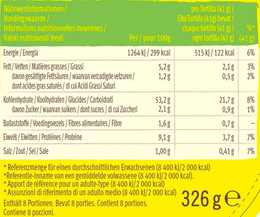 Was sind Flour Tortillas? Tortillas heissen übersetzt „kleine Torten“ und sind runde, dünne Teigfladen aus Weizenmehl. Unsere weichen Flour Tortillas werden aus frischen Teigbällen im Ofen gebacken bis sie schön knusprig sind. Tortillas sind das Brot der Mexikaner und die Grundlage jeder Mahlzeit. Sie können mit Fleisch, Bohnen, Käse oder Gemüse gefüllt und anschliessend zu einer Fajita oder einem Burrito gerollt werden.